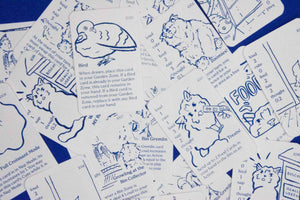 Waffles, our beloved family cat, has finally gone and got a job! Enjoy 8 randomly selected, hand printed art cards based on situations our silly son puts himself in!